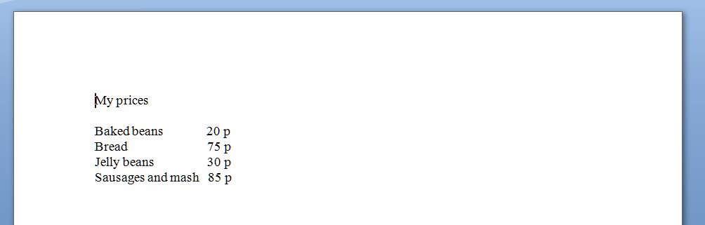 Here’s your common short cut, to start off with. You’ve got a menu you want to put on a document, with items in one column and prices in another. So you type it out, using the space bar to move along to the next column. And it looks like this: