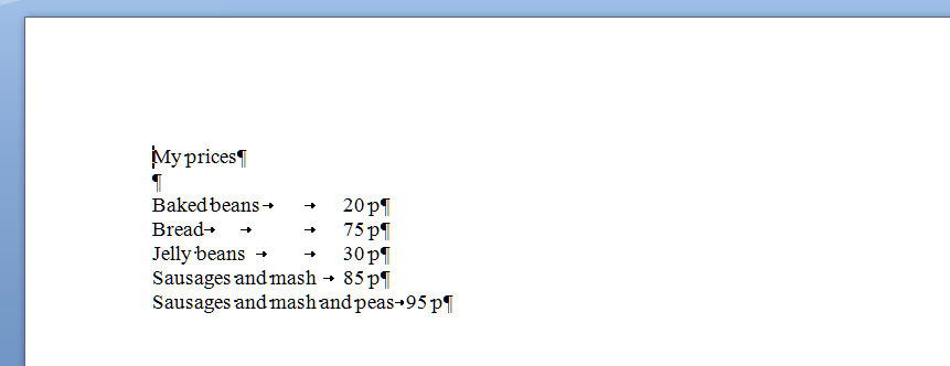 Now, when you want to move the prices over for all the shorter items, you just need to insert one press of the tab key at the end of each item, to get them to line up perfectly.