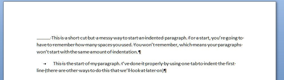 And here’s a last example. It’s very common to find people wanting to indent the first line of a paragraph, but using spaces to do so. This has its own issues – for example, you have to remember how many spaces you’ve put in and it’s likely that you’ll insert a different number each time, which will lead to indentations that don’t match. Instead, a simple press of the tab key at the beginning of your paragraph will leave everything nice and tidy