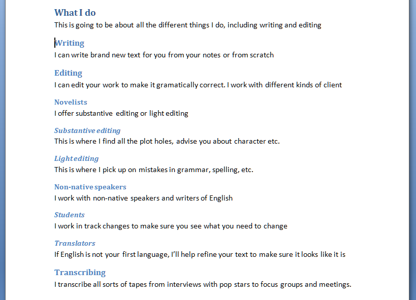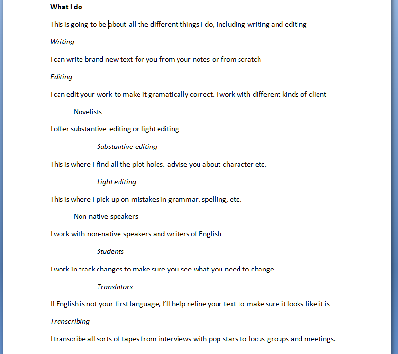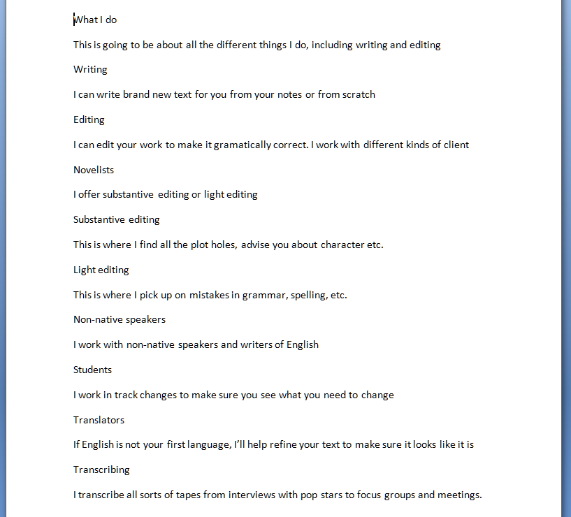 You will use this to save yourself time and ensure consistency when you’re setting up a large document with lots of headings and sub-headings. Imagine I’ve written a document about what I do in my business. I might write it up like this (you can imagine the one-word sentences are longer paragraphs if that helps!)