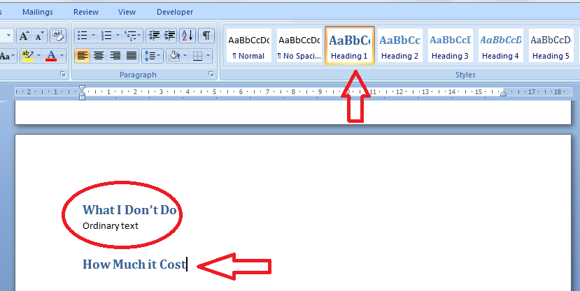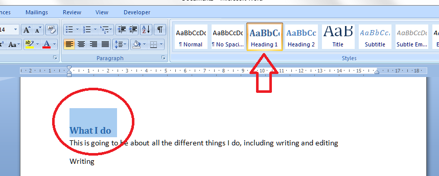 Note: you don’t have to have all the text already written, highlight and click. You can also click Heading 1 (or whatever) when you want to type a new heading; the text on that line will adopt the Heading 1 format until you press return.