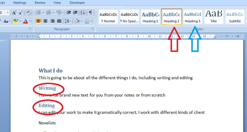 Time to do the Heading 2 level now. Oh – if you want to be clever, highlight each example of a heading you want to change to Heading 2, keeping the Control button pressed on your keyboard as you do so. This will highlight all the text you want to alter at once, saving a few clicks.