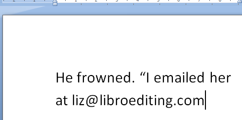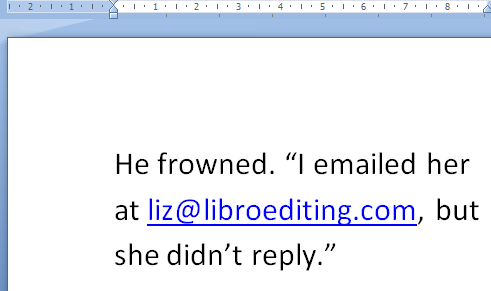 The other annoying “feature” is when Word automatically turns any URL or email address you type into a hyperlink, complete with attractive text colour change and underline. This is all well and good if you’re typing a document that will be looked at on screen and you want the reader to be able to click through, but if you’re just happening to type an email address into the dialogue in your novel …
