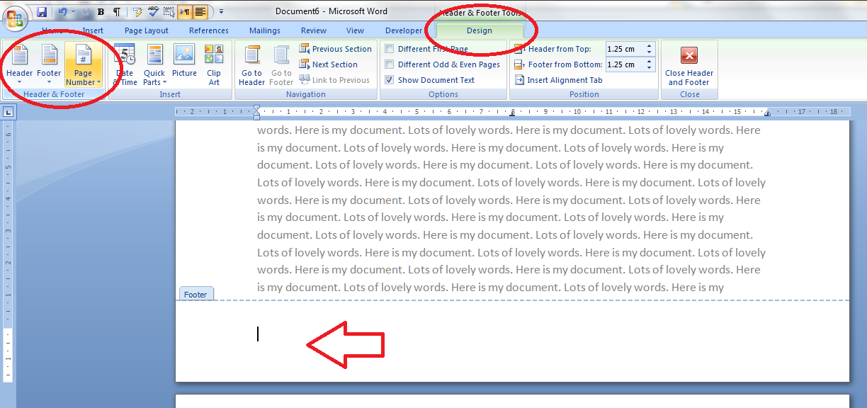 Method Two involves clicking with your left mouse button in the blank space at the bottom (or top) of your page. Another way to do this is to select the Design tab, but sometimes that doesn’t show up by default. Clicking on the blank bit of the page will bring up the Headers and Footers and your Page Numbers button: