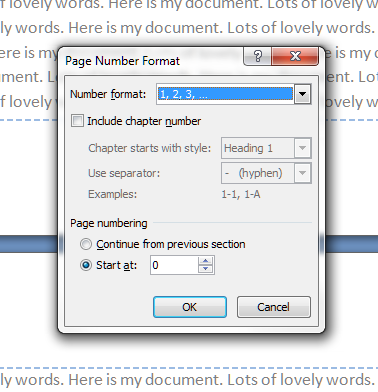 Again, Chapter numbering and Continue from previous section / Start at are mainly used when you’re applying different numbering styles to different parts of your document (Roman numerals for the contents page and foreword, Arabic for the main text, etc.) but it’s worth knowing where to find these choices for next time.