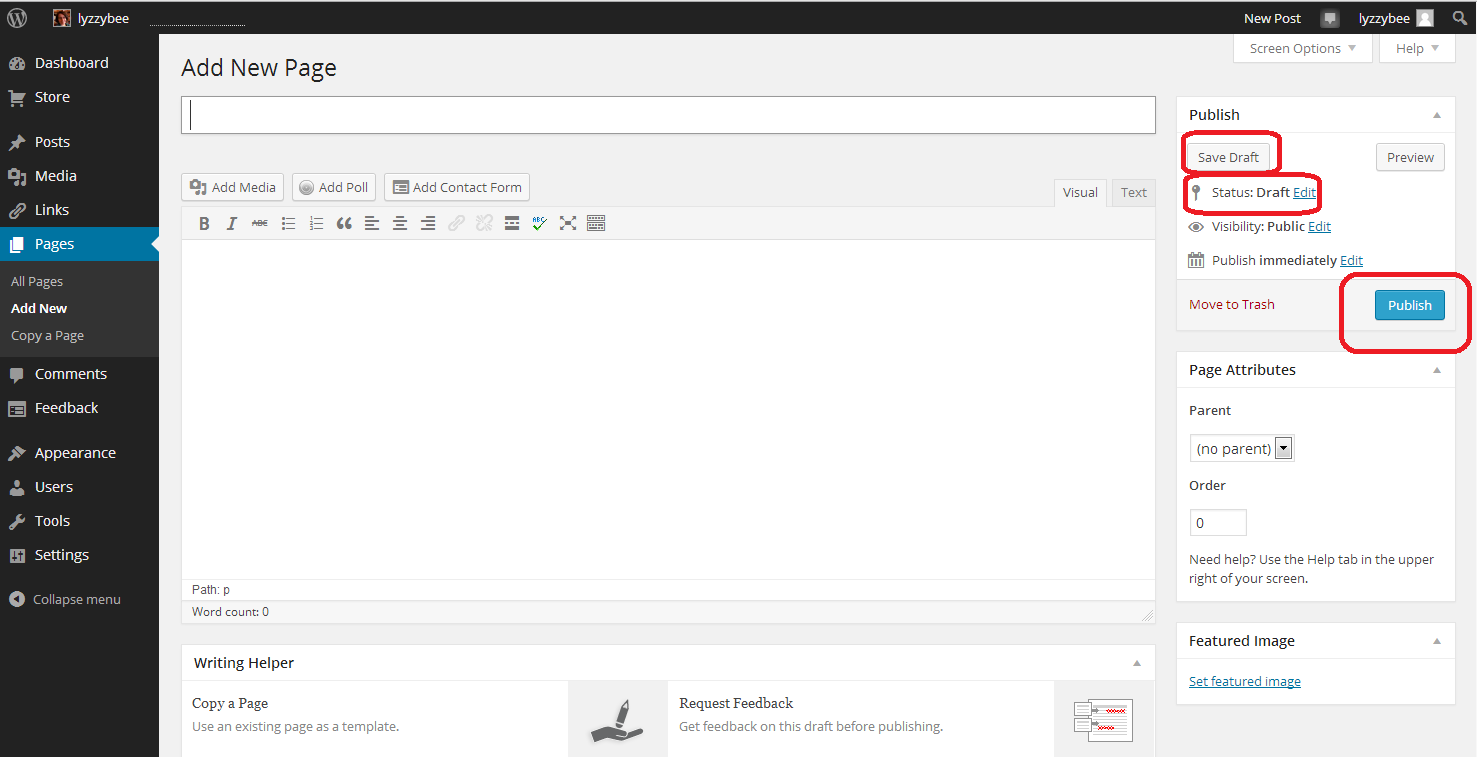 Once you’ve started writing your post, hit Save Draft and continue to press that regularly so you don’t lose your work. Once you’re ready to publish your post, press Publish!