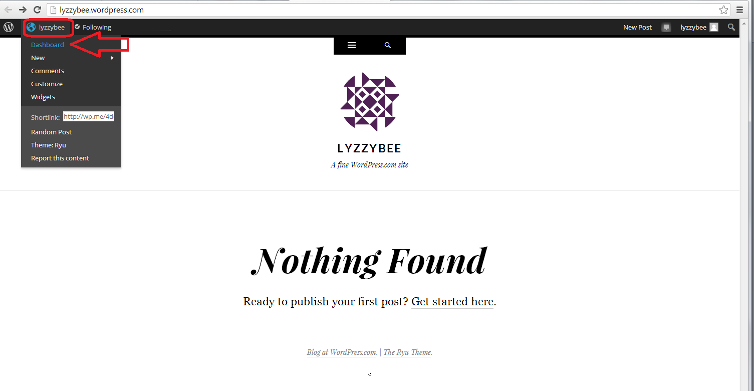 Whenever you’re logged in to WordPress and want to do something with your blog, whether you want to alter the settings, write a post, check your comments … you can access the Dashboard (which allows you to do all of this) by clicking on your username at the top and then clicking Dashboard: