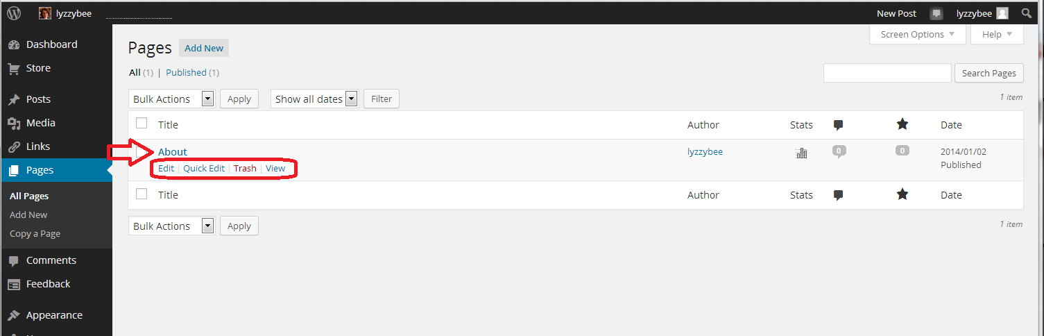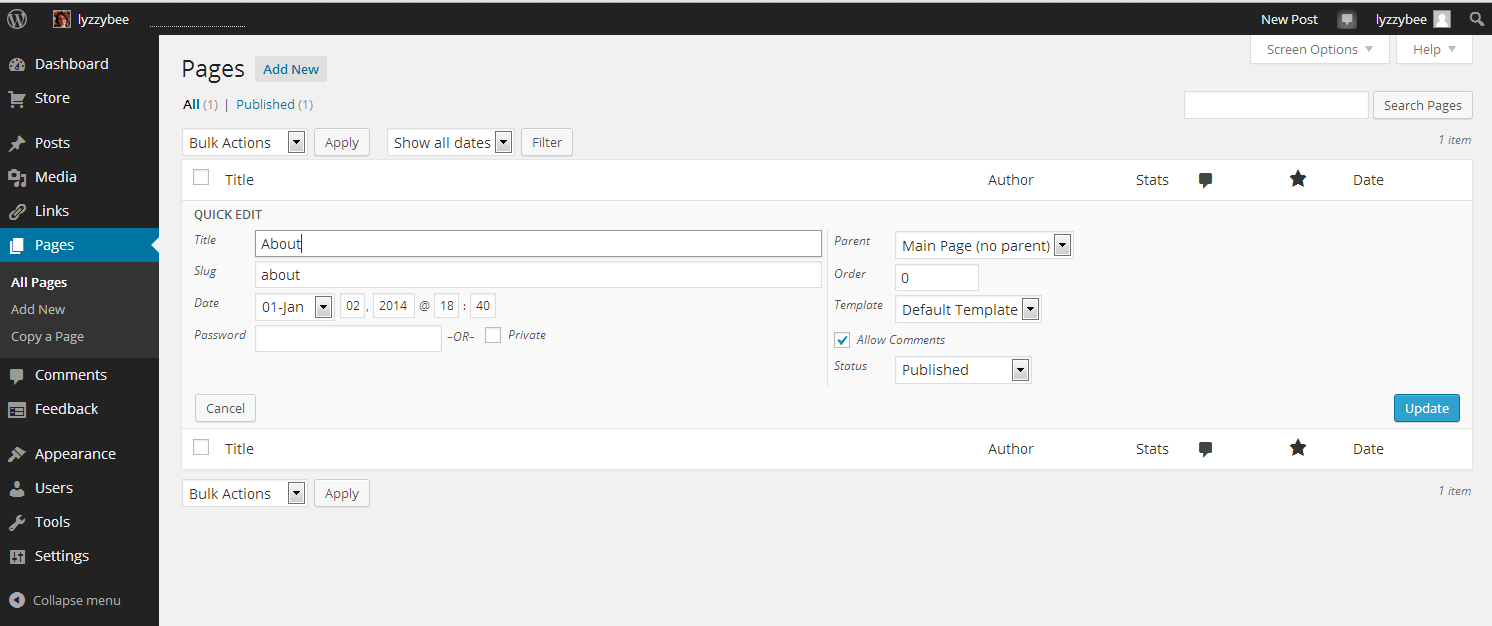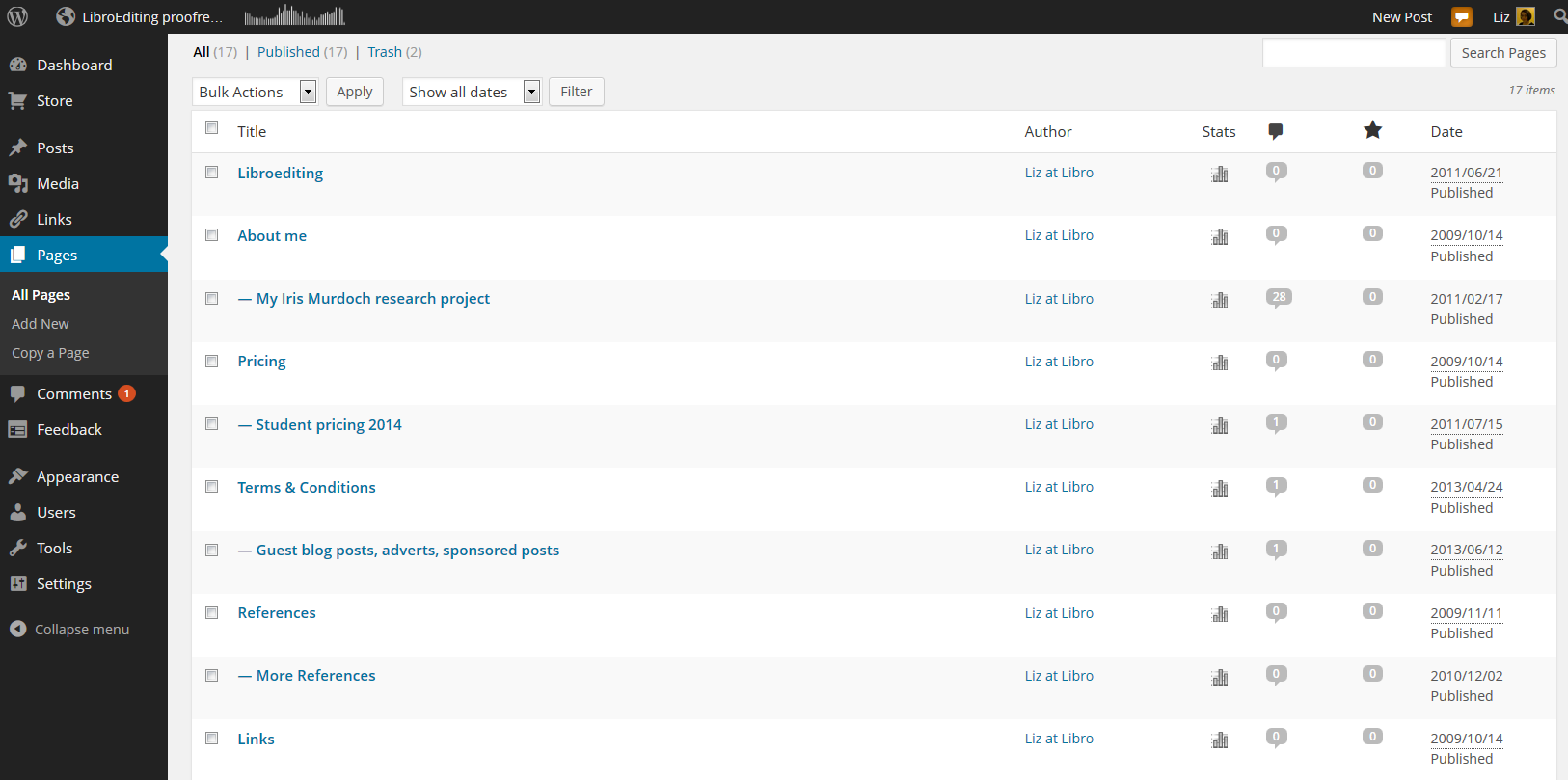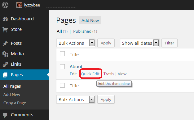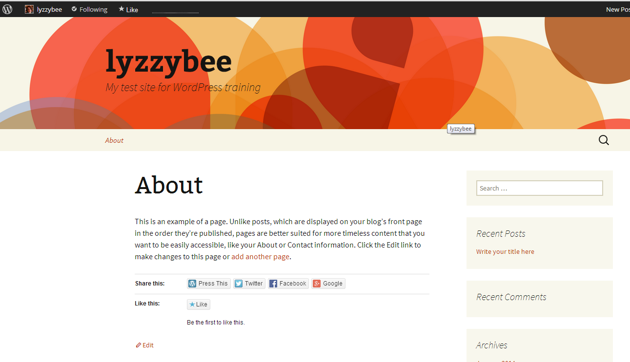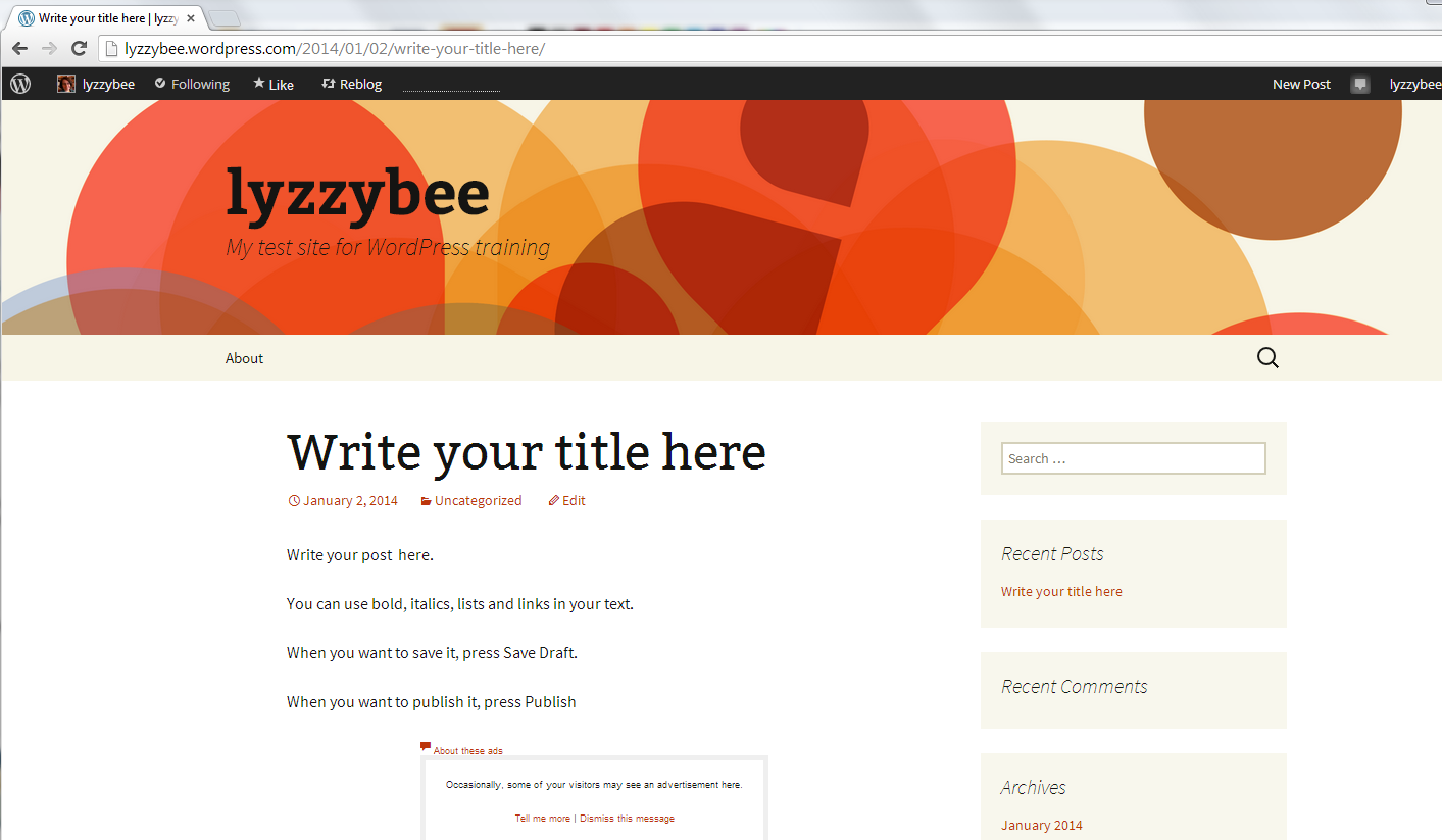 Whizz up a couple of pictures to that blank white screen that says “Nothing Found” in the middle of the screen. Notice how underneath the blog name “Lyzzybee”, it says “A fine WordPress site”. Well, that’s all well and good, but this is where you can describe what the blog’s all about. This blog that you’re reading now has the subtitle “Proofreading, editing, writing, transcription and localisation”, and this field is searchable by search engines, so it makes sense to get your keywords in there and tell people what it’s all about (another of mine can be found here).