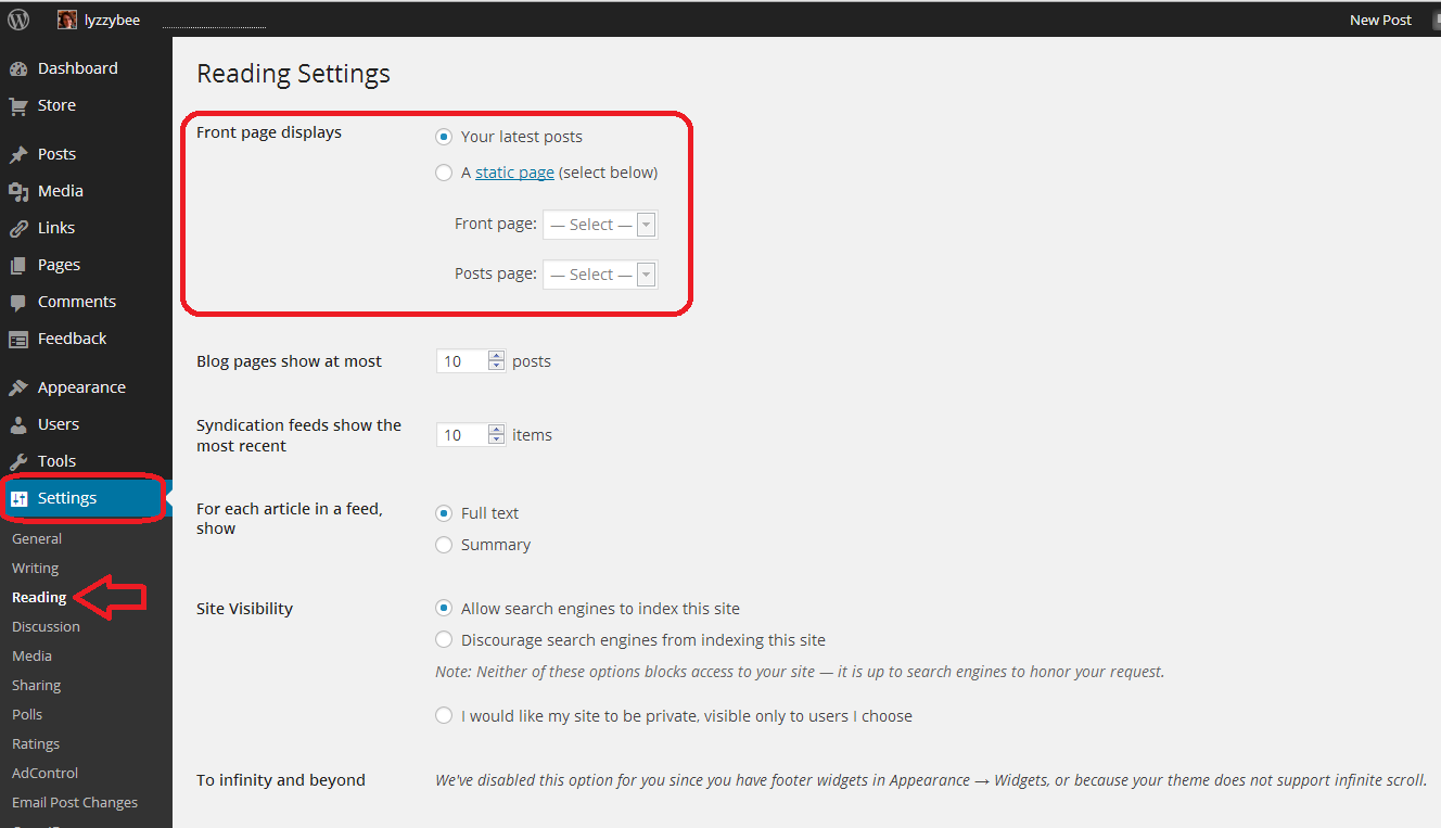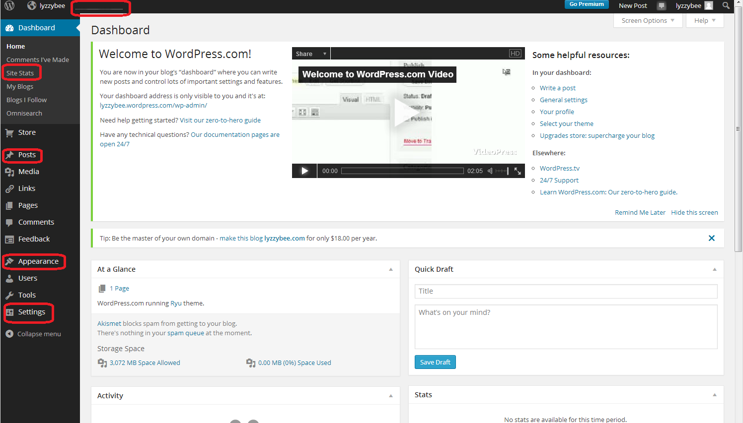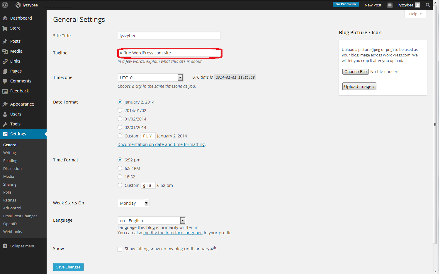 Remember what I said above about not being able to change your blog’s web address, but being able to change its name and subtitle? I’m going to show you how to do that first, mainly because WordPress adds its own subtitle to your blog, and we want to customise it for ourselves.