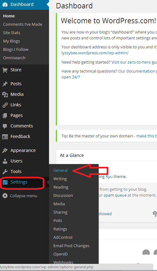To change this, go down to the bottom of the Dashboard and click on Settings. You’ll get a sub-menu, and you now choose General: