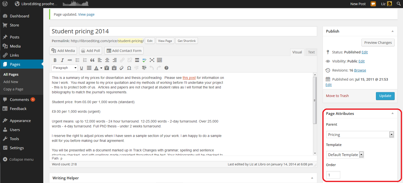 Once you’ve got a title in place, WordPress will create a Permalink (URL) for it. You can alter the words in this after the date, so if you don’t want to be sharing a huge URL, you can cut it down (e.g. this very post has a URL ending wordpress-blog-basics, which is not the full title of the post).