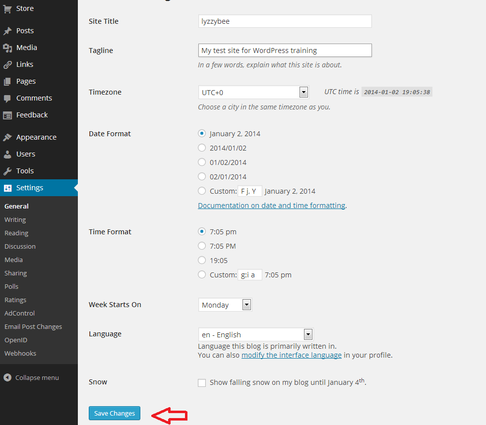 So I type in “My test site for WordPress training”, because that’s what it is, and then press the Save Changes button at the bottom of the screen to save that. There are lots of other things you can change on this page; do have a play with them if you’re feeling confident, but it’s not strictly necessary at this stage. Everything can be accessed and changed later on.