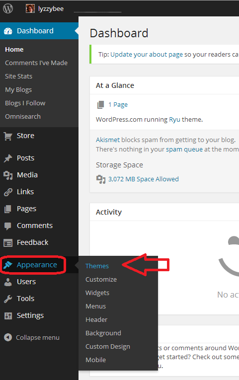 To set up your new theme (or change your theme once you’re up and running), click Appearance on the Dashboard, and then Themes: