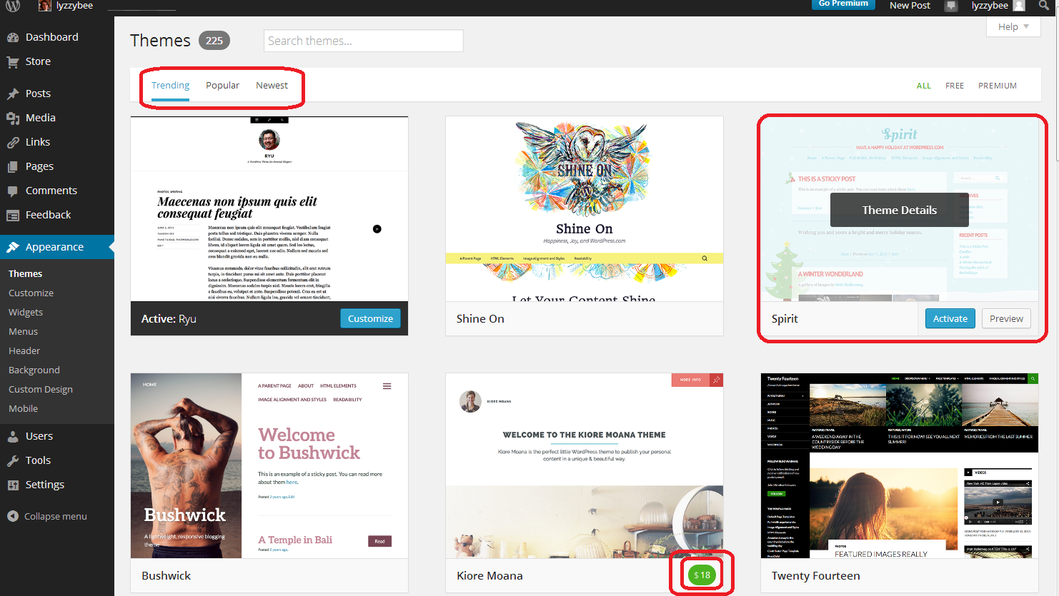 • You have to pay for some themes (see the double circle at the bottom). There are LOADS of free ones so certainly don’t bother to do that at the start.