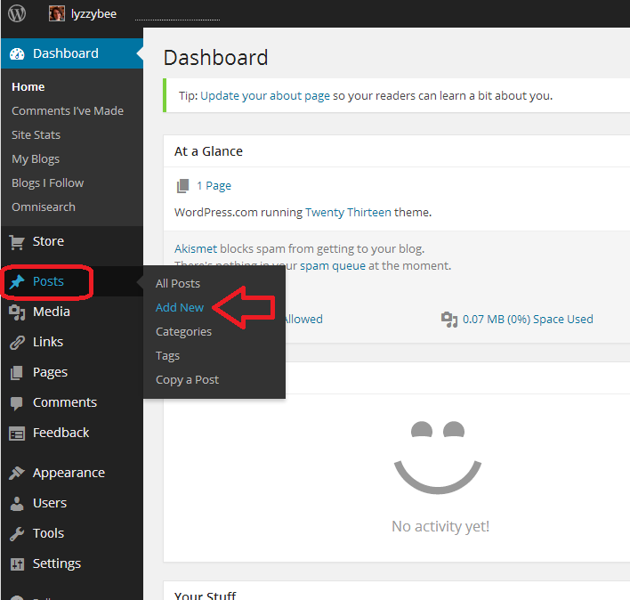 To write a blog post, go to Posts on the Dashboard and then click Add New. There are some other options there but this is getting LONG and we’ll just do the basics.