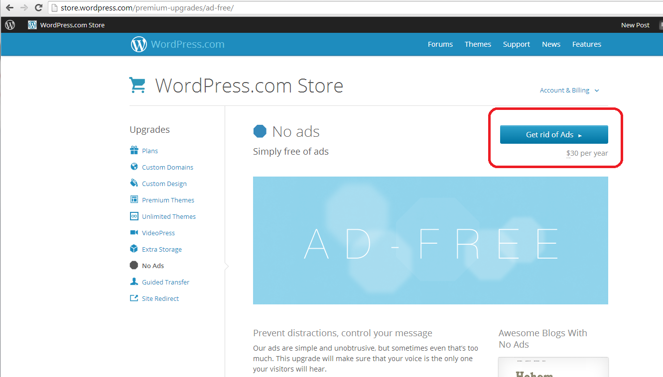 You will be taken to the WordPress Store, where you can choose Get rid of Ads. This will take you to a payment screen where you can pay by PayPal or debit or credit card. As I said, well worth doing to avoid annoying people who read your blog.