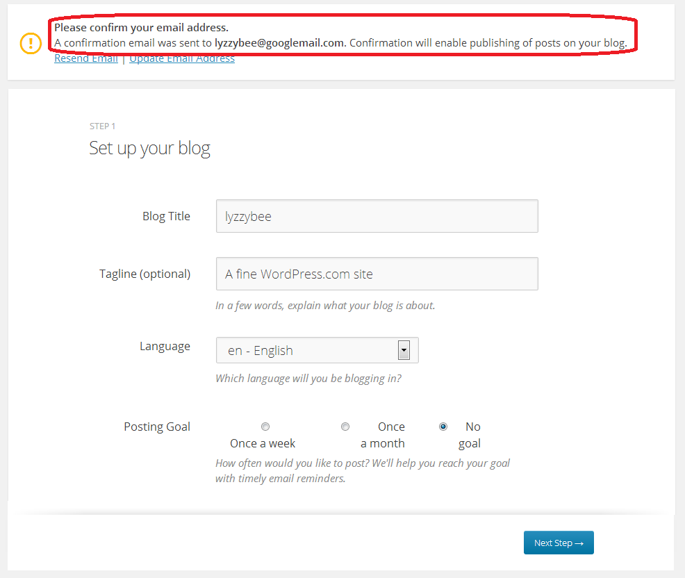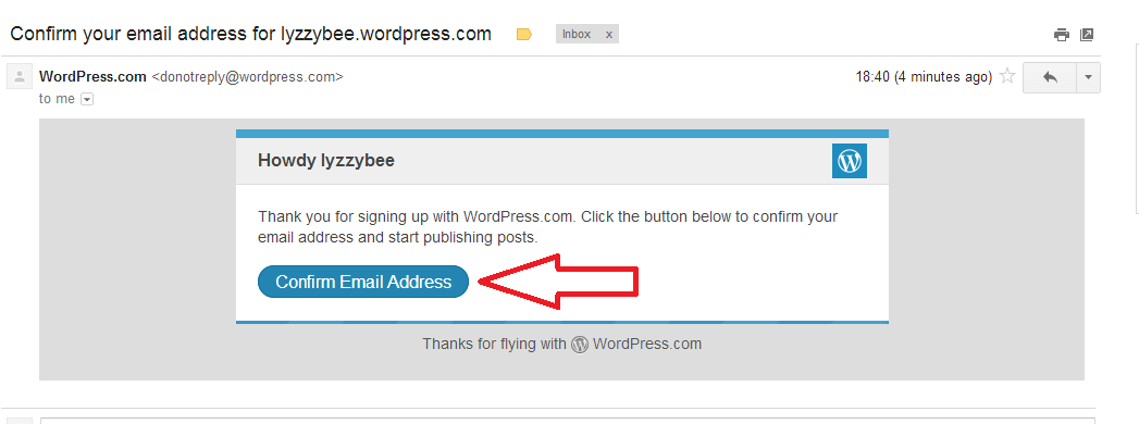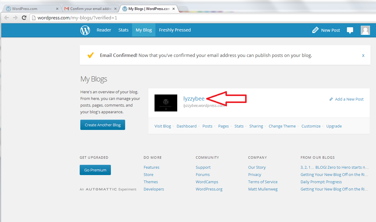 … and you’ll be back in WordPress (in a new window) with the email address confirmed and able to do what you want with your blog!