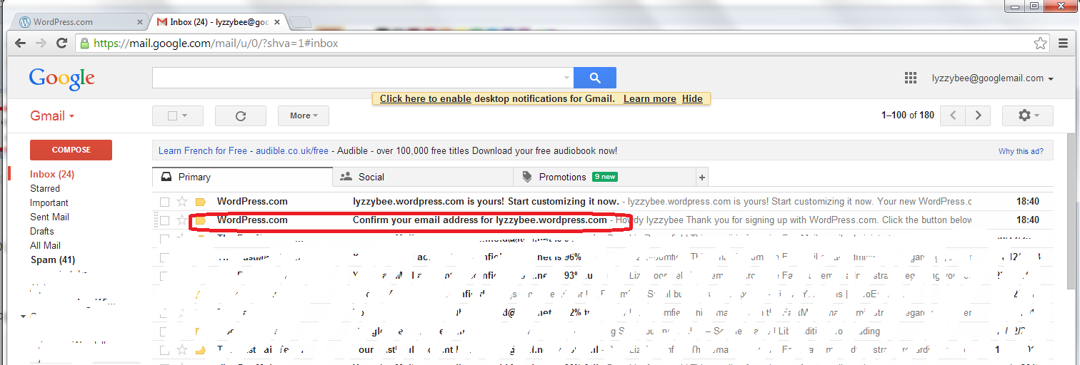 But, all being well, you should find an email from WordPress in your email inbox, with the subject “Confirm your email address for [your blog address]” – it might be the second one from WordPress, as here: