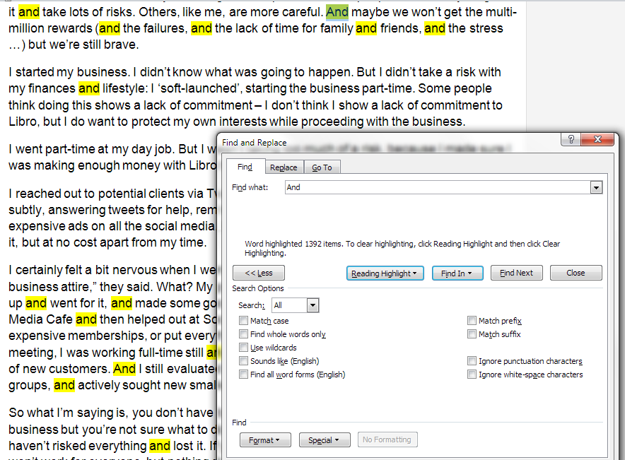 This can be really annoying, especially if you’re searching for a word that can appear as part of other words (like under, or stand!) and you want to do a Replace All on them or just find when you’ve used that particular word, not its compound. This is what happens when you don’t choose any options: