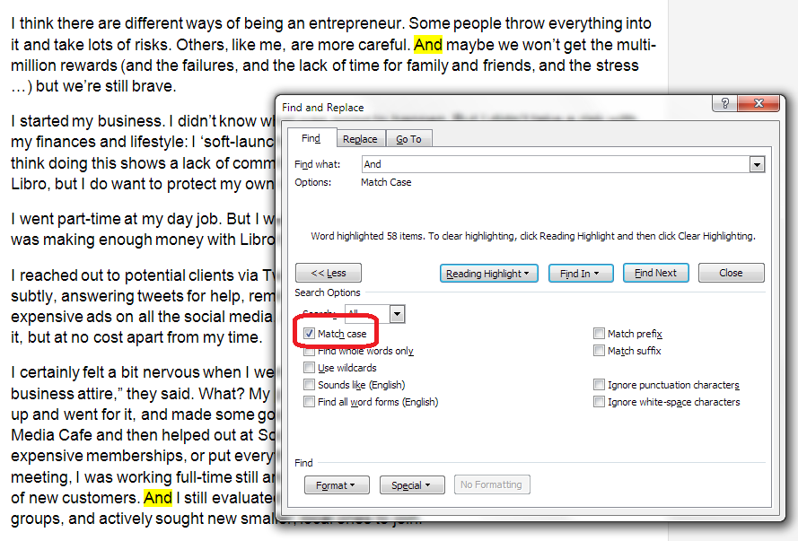 Tick the Match case box and it’s a different story. Now it’s only looking for And with a capital A. Note how the line under the search box includes a note of the option that I’ve selected: