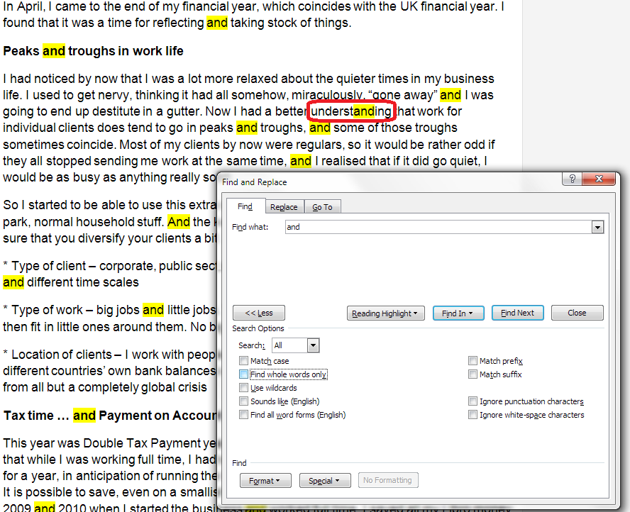 As we saw briefly above, search for “and” without ticking any additional options, and Word will find the letters “and” however they may be capitalised and wherever they will be. Here, a search for and highlights the word understanding, too.