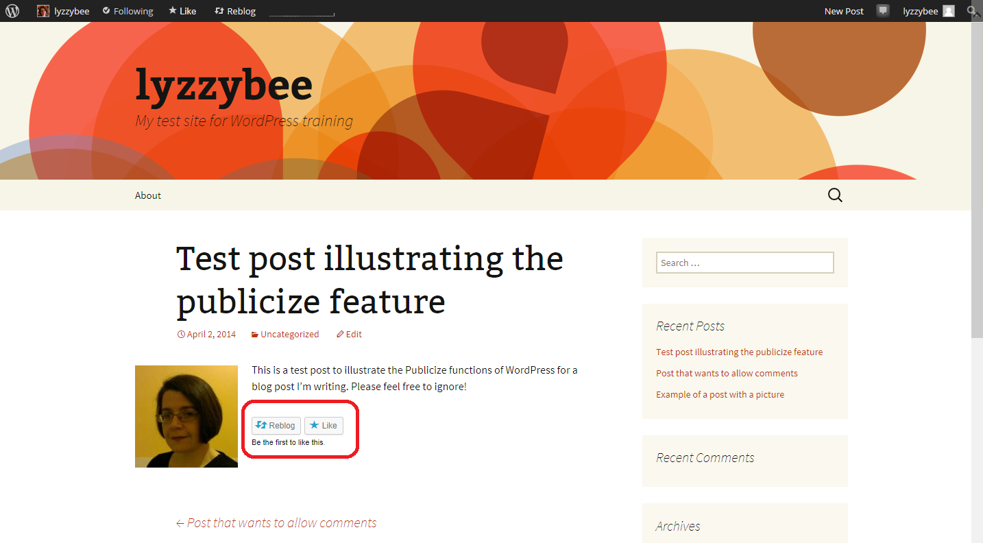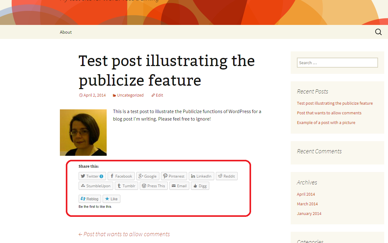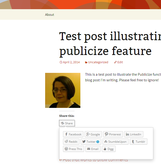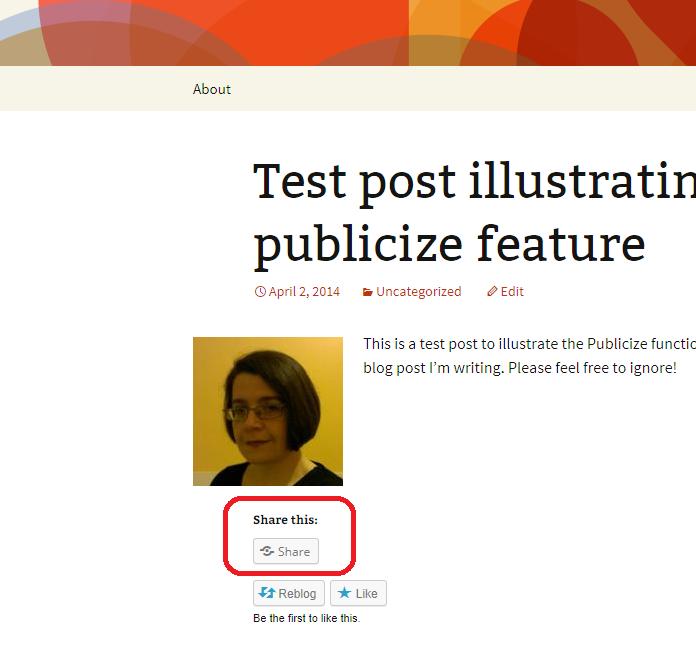 Here’s an example of a blog post without any sharing buttons. As standard, WordPress adds a button to “Like” a post (which just alerts you and makes a nice little line of pictures under your post, but doesn’t share anything) and a Reblog button which allows another WordPress user to share the post on their blog, with an excerpt of the content and a link to the rest of it. Other than these, there are no ways to share this blog post at present. You can even turn this off if you want to, see the Advanced Features heading below for more information.