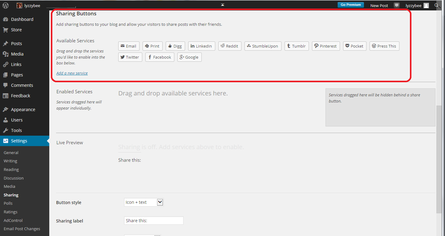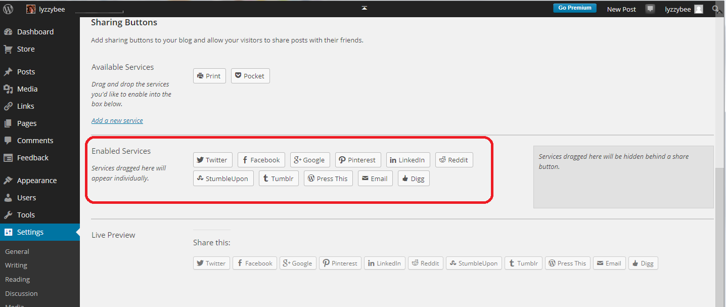 All of the sharing buttons that are available to be added are shown in the upper Available Services section. You can add buttons for sharing to Twitter, Facebook, LinkedIn and other social media platforms as well as sites like Tumblr and Digg that curate information on topics onto pages, and Email and Print: