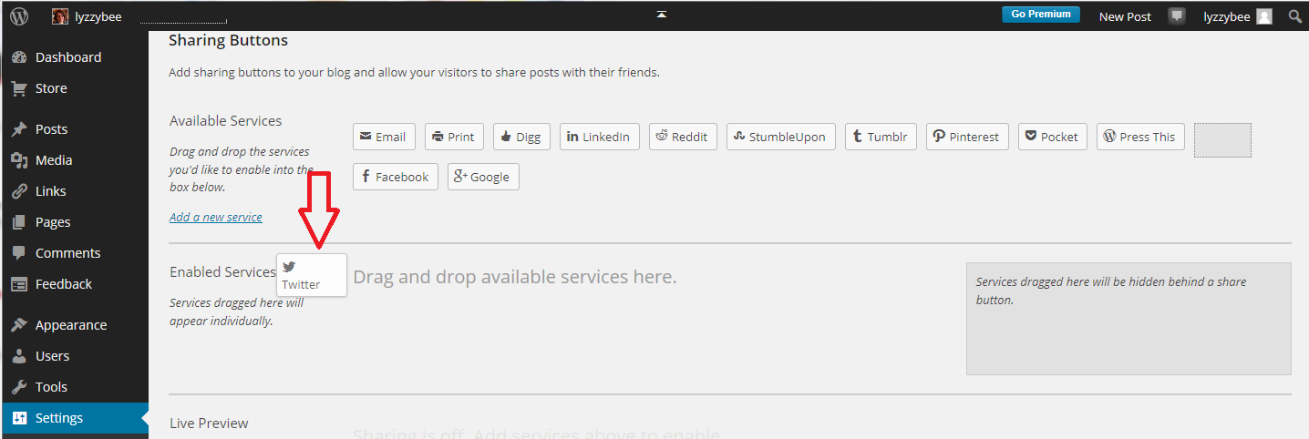 To make a sharing button appear at the bottom of your blog posts, left-click on the button, drag it down to the Enabled Services section and let go to drop it there. It will then appear in the Enabled Services section: