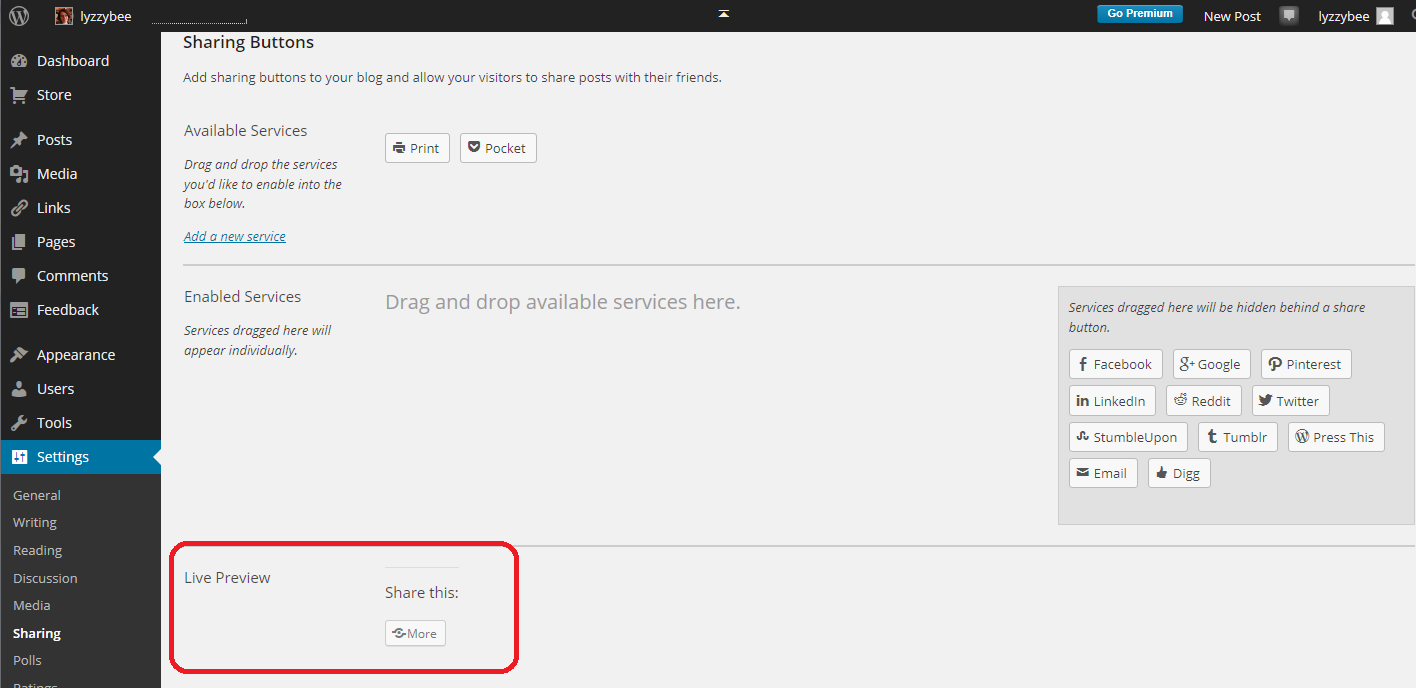 Sharing buttons are handled in the Settings – Sharing section of the Dashboard: