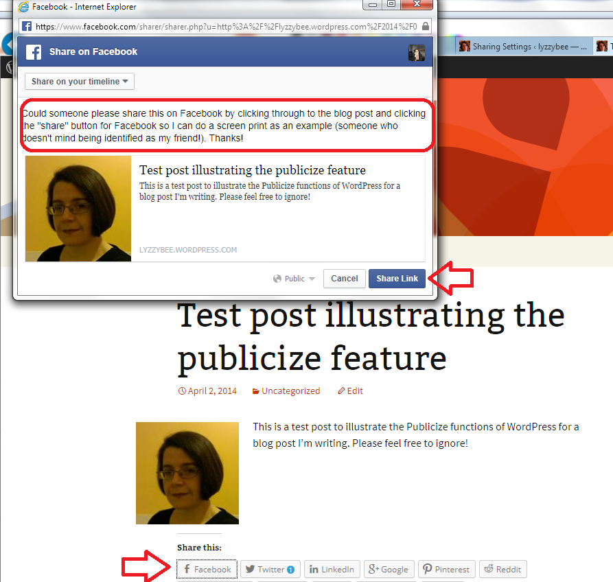 You can click on your own sharing buttons to see what happens, and this is what I’ve done here. I’ve clicked on the Facebook sharing button. A Share on Facebook dialogue box pops up and you can select whether to share on your timeline, to a person’s timeline, to a page or to a group, and enter some status text to explain what you’re sharing and why you’re sharing it: