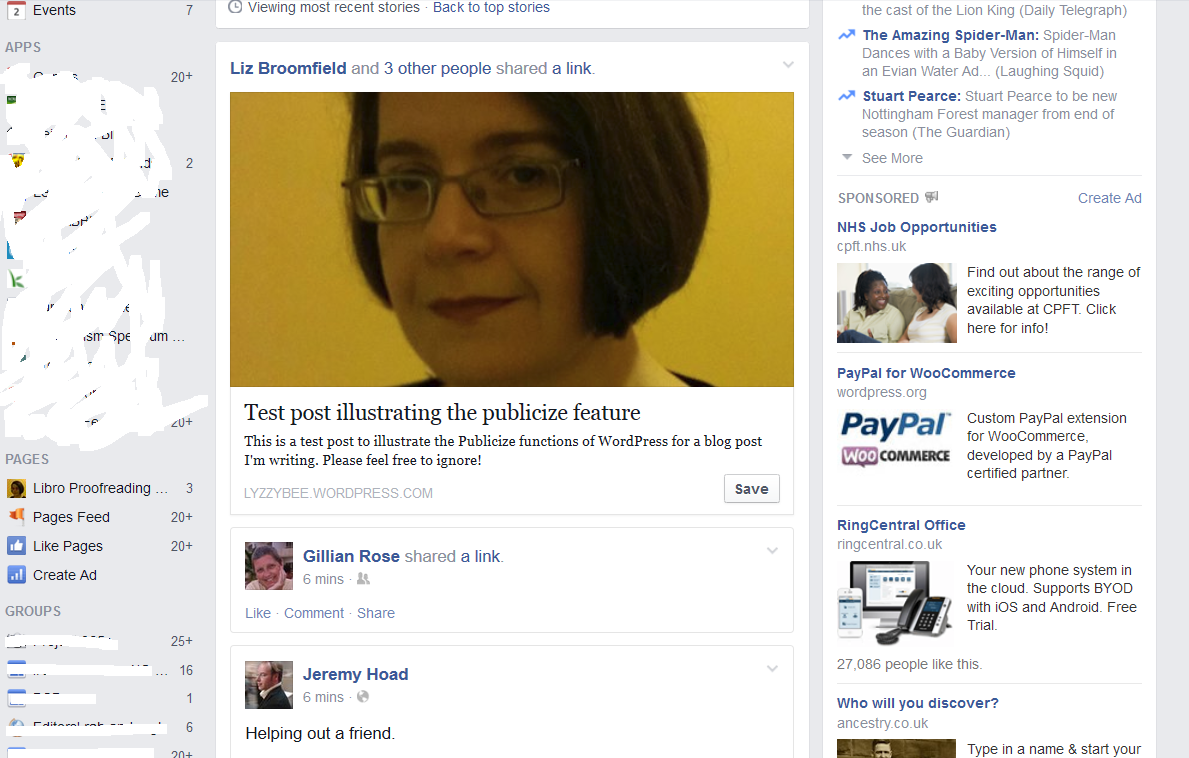 Let’s have a look at what content shared from your blog might look like on a couple of social media platforms. Here’s my shared post appearing on my Facebook timeline because my friends Gill and Jeremy have shared it. Just like those shared links you see all the time on your timeline. If your friends share your link, you should see it come up in your own timeline.