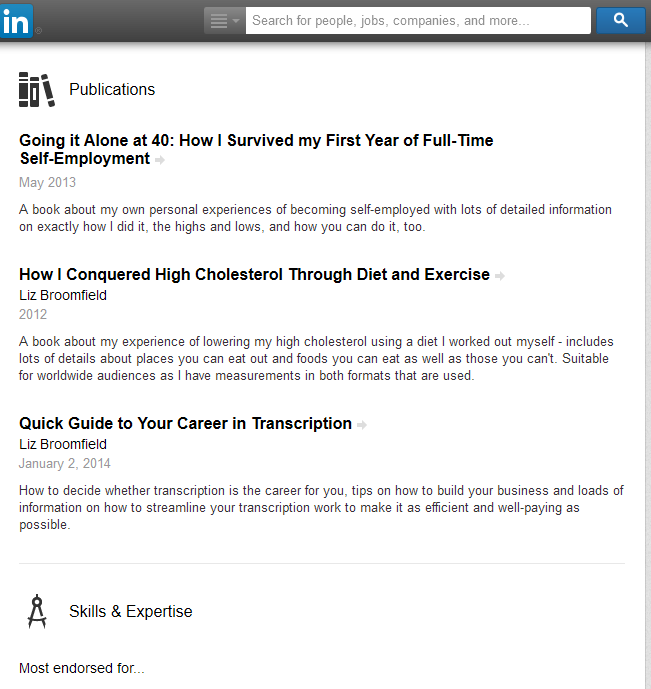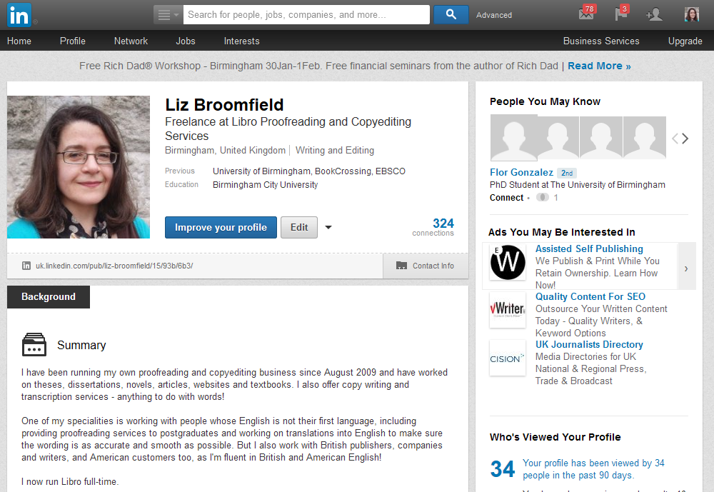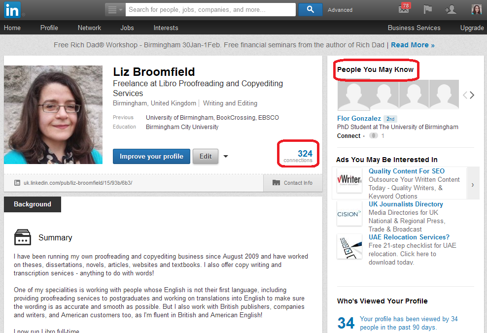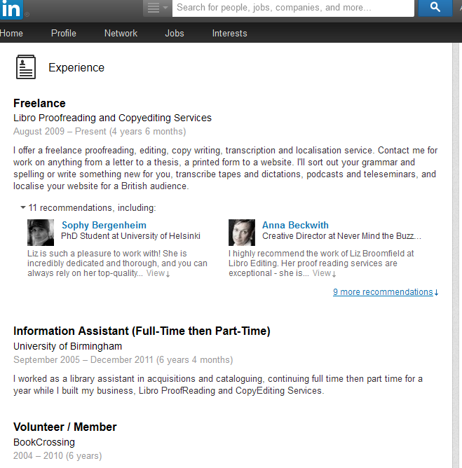 There are various sections to fill in on the profile; including past jobs allows your ‘network’ to grow, as LinkedIn, unlike other social media, will not let you even request to connect to just anyone. For example, I’ve added my experience in here: