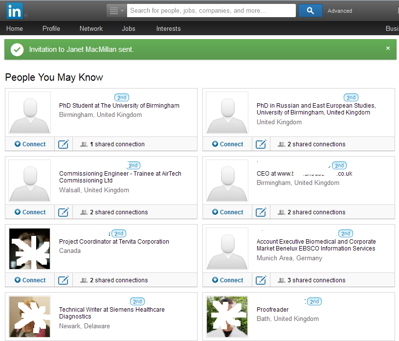 Click on People you may know and you’ll be given a list of possible connections (I’ve blanked out names and obscured photographs because this is my own LinkedIn profile):