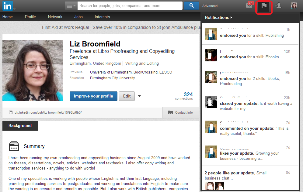 Similarly, if people recommend you, or if they use the Endorse buttons that appear at the top of the screen when you log in to say that you’re knowledgeable about a certain topic, do try to recommend and endorse them back.