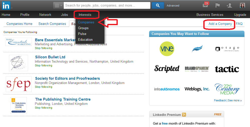 To set up a company page, click on Interests at the top, then Companies from the drop-down.
