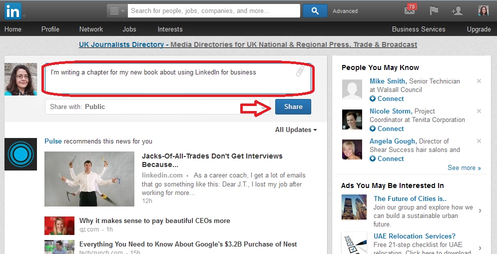 You can post updates, just like on Facebook – do this from the Home page. Your updates will appear on your connections’ home pages, just as theirs do on yours. You can like and share updates in a very similar way to Facebook.