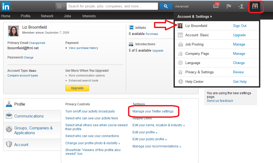 You can direct most blogging platforms to automatically post links on LinkedIn – all of my WordPress blog posts do this. You can also link your Twitter account to LinkedIn by going to your account settings (click on the small photo in the top right of the screen), clicking on your name and choosing Manage Twitter Accounts.