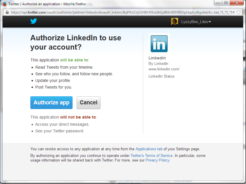 If you’re logged in to Twitter you will see this Authorize app message, if you’re not logged in, you will be asked to log in first. And there you go: