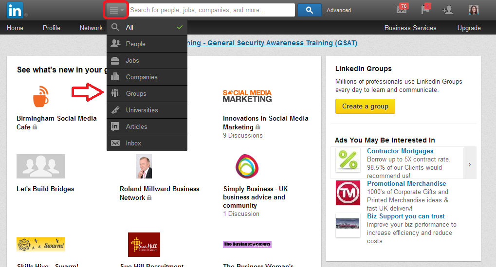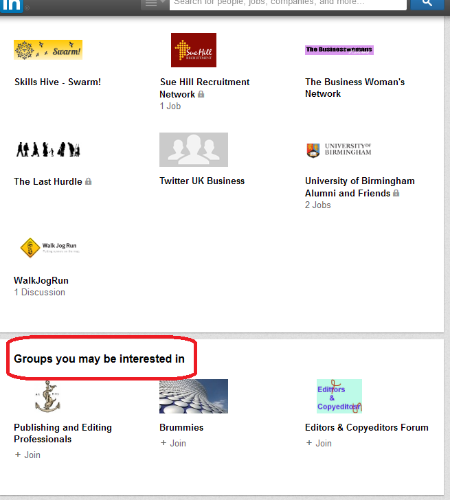 Access Groups by searching in the top search bar (you can click on the icon to the left of the search area and select only Groups to search) or by clicking on Interests then Groups. Once you’ve joined some Groups, you will find them listed on your Groups page, and then some suggestions underneath.