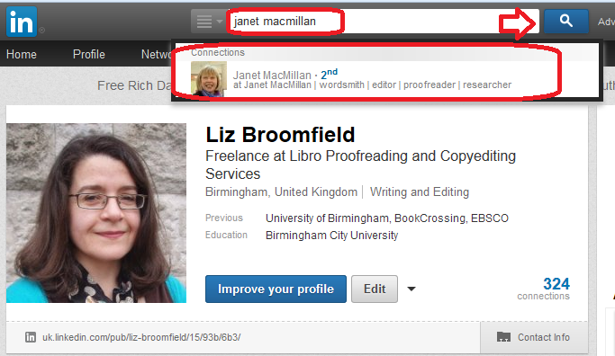 You can find people just outside your network by clicking on the People You May Know link. This will give you a list of either friends of friends or people who have said that they work or have worked at the same organisations that you’ve worked at. You can connect to these people in the same way. You can also search for people using the search box at the top of the screen (Note; I asked Janet’s permission to use her profile in these images):