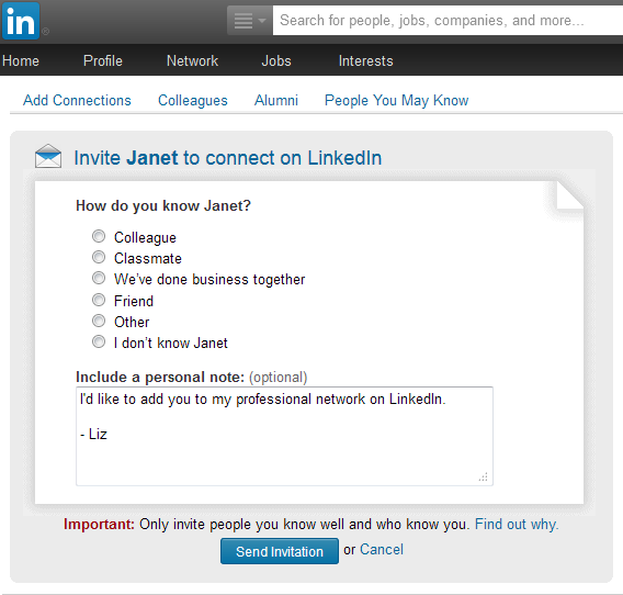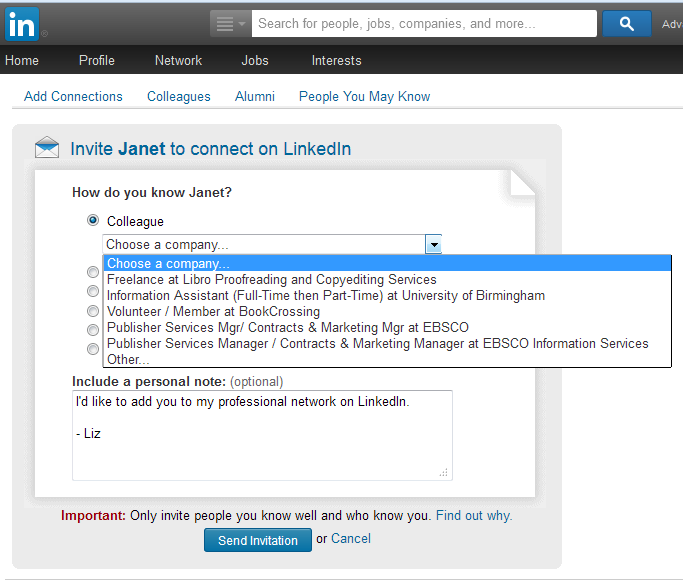 LinkedIn is different from other social media networks, in that you have to have a tangible connection to a person in order to ‘Link’ to them. If you find someone you want to link to and press Connect, you’ll be asked how you know that person. If you say that they’re a colleague, or that you’ve done business with them, you’ll be asked which of your jobs they are a colleague from – that’s why it’s important to list all of the companies that you have worked for on your profile. If you say that they’re a friend, you’ll be asked to prove you know them by providing their email address.