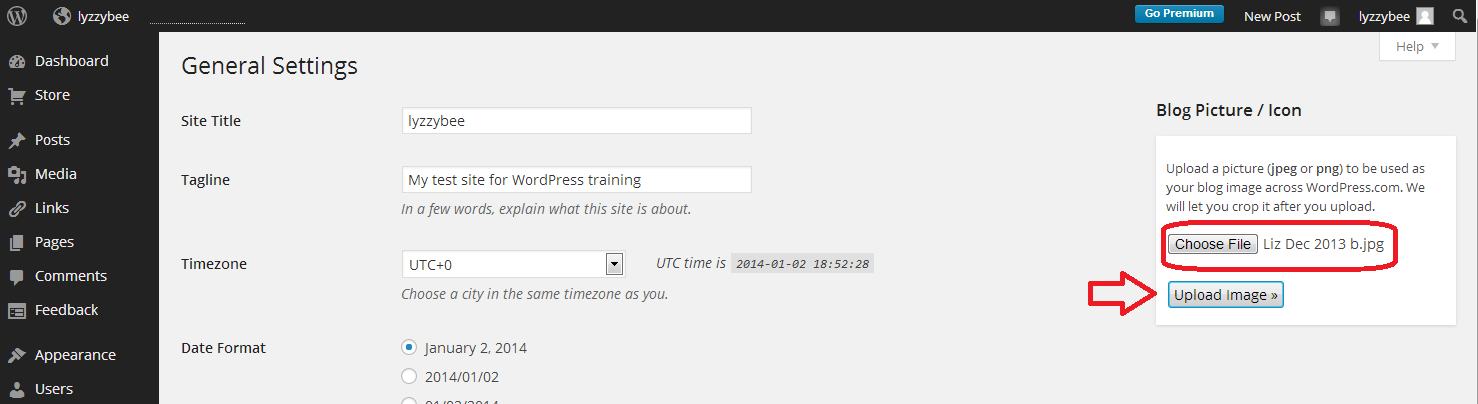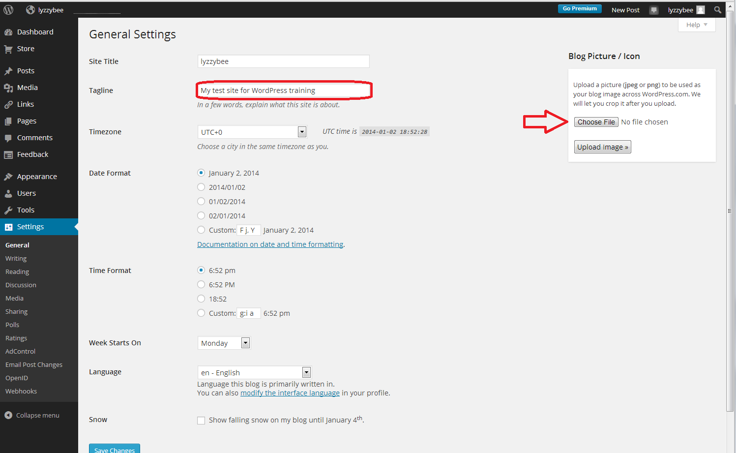 The General Settings are where you do things like changing the title and tagline for your blog – and over to the right, you can change your blog picture or icon. Click on Choose File: