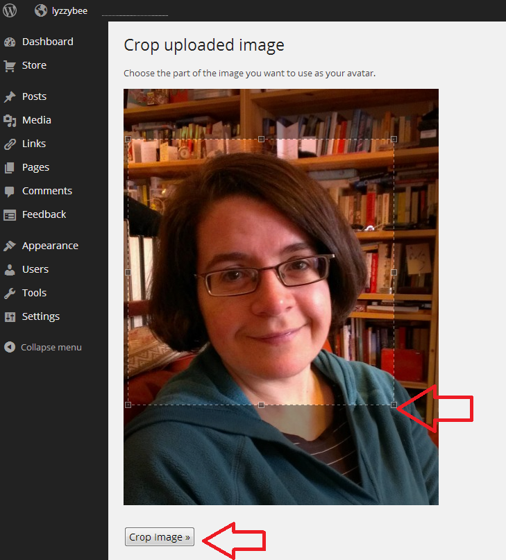 Once the image has uploaded, you’ll have the opportunity to crop it. The image will be quite small on the page, so it’s important to have your face (or the main part of whatever image you use) filling the little square. Move the dotted lines around the square until you’re happy that you have a big, central image: