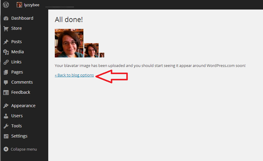 You will be shown what your image will look like in various places on your blog. Go Back to blog options anyway, but you can always go back around the loop and change or upload a new picture.