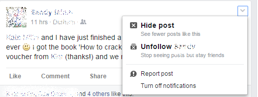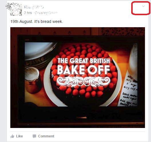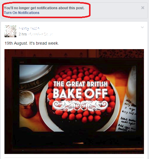 In this example, a friend has posted about the Great British Bake-Off and another friend has mentioned, and tagged me in their comment, that I haven’t seen it yet and will be watching it tomorrow. I don’t want to see any more comments in case someone lets slip who’s left the competition.