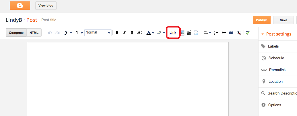 Blogger works in a similar way to WordPress, but the icon you need to use is the word Link: