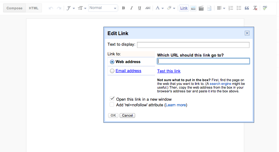 and the dialogue box doesn’t give you the option to choose a previous blog post to link to, but has the familiar URL entry field: