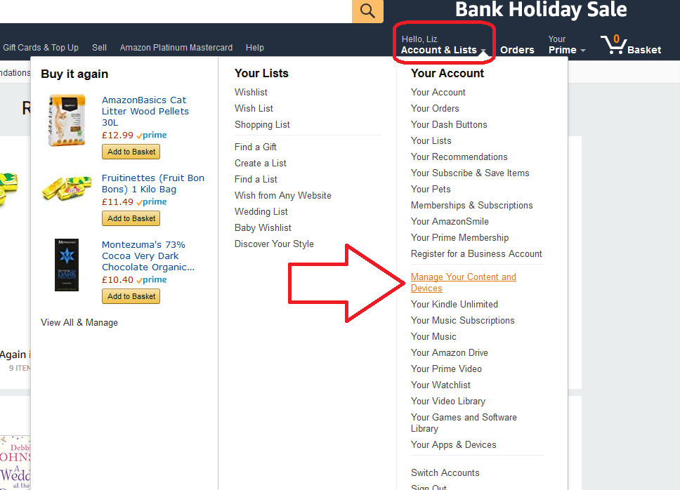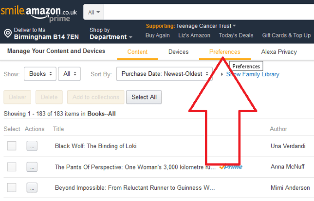 Manage Your Content and Devices defaults to Content view, showing you the alarming number of Kindle books you have downloaded and that’s just from Amazon, it doesn’t include all the ones you’ve had from NetGalley or Gutenburg, etc. Argh! Anyway, ignore that and select Preferences: