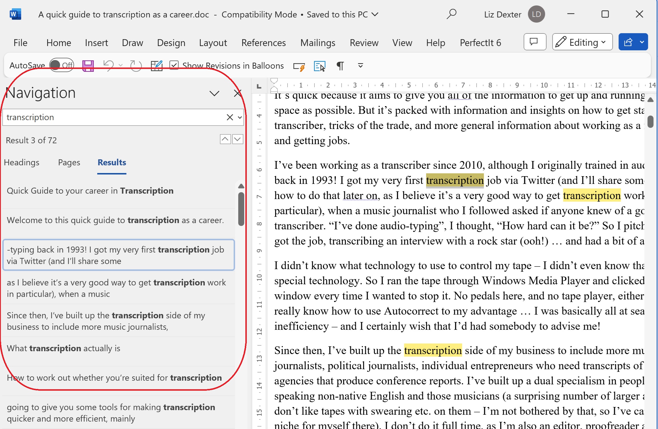 The navigation pane (or document map) is that area to the left (usually) of your Word document which gives you the option to view the headings and layout of your document, the pages, or search results for a term you’ve looked up. It normally looks like this: