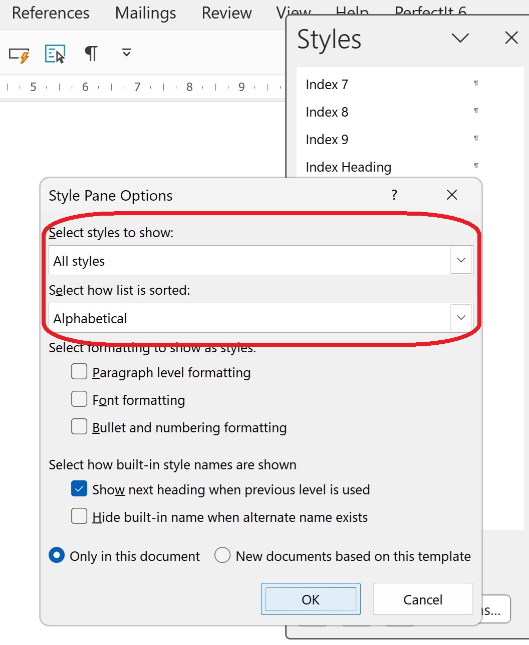 Then change the drop downs to “Select styles to show”: All styles and “Select how list is sorted”: Alphabetical.